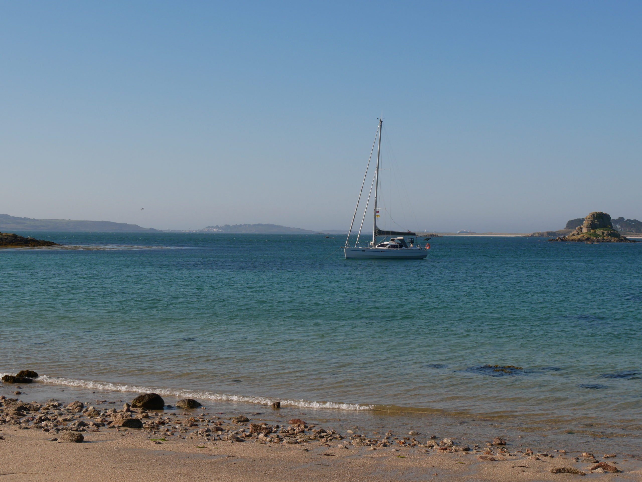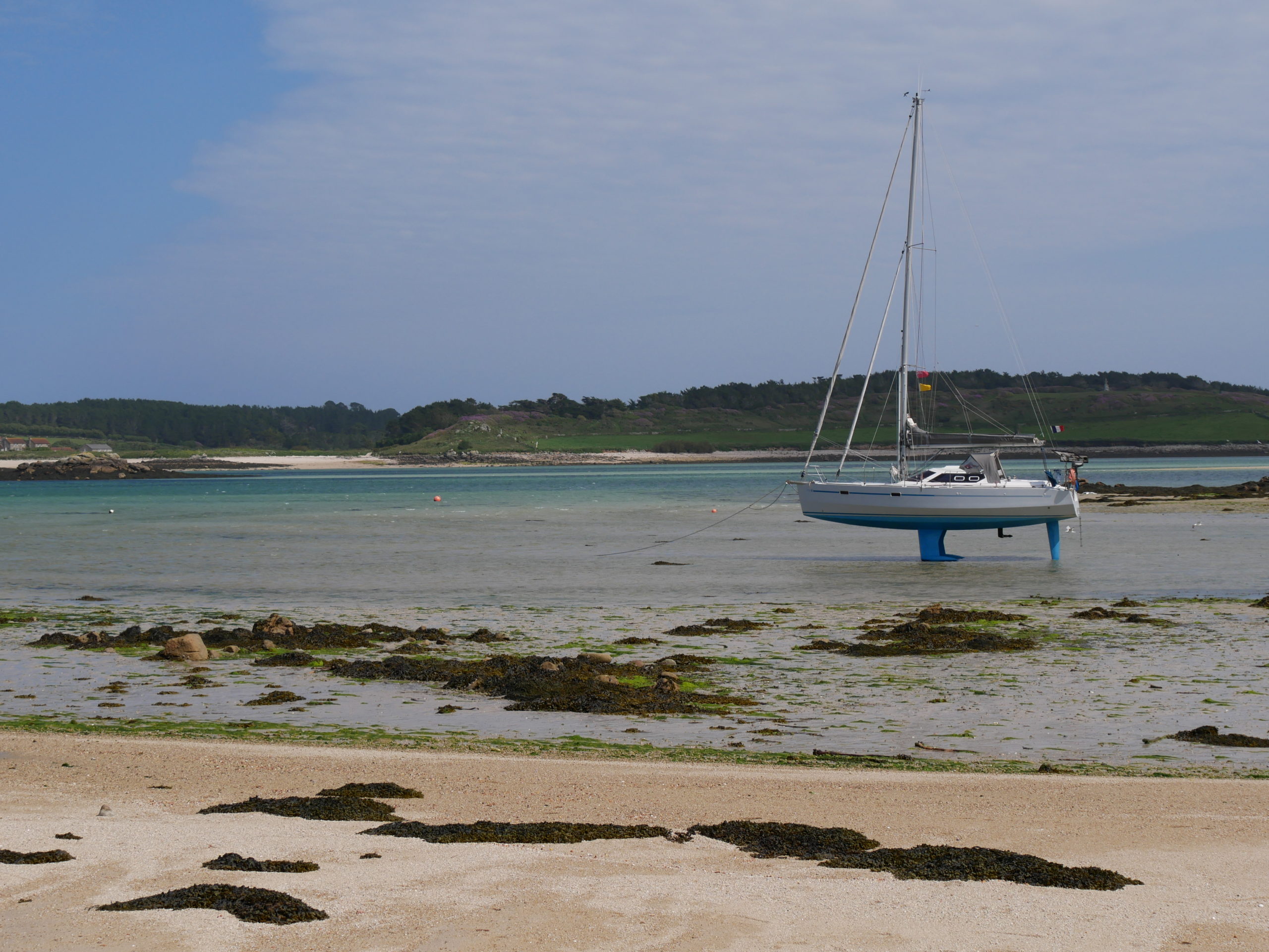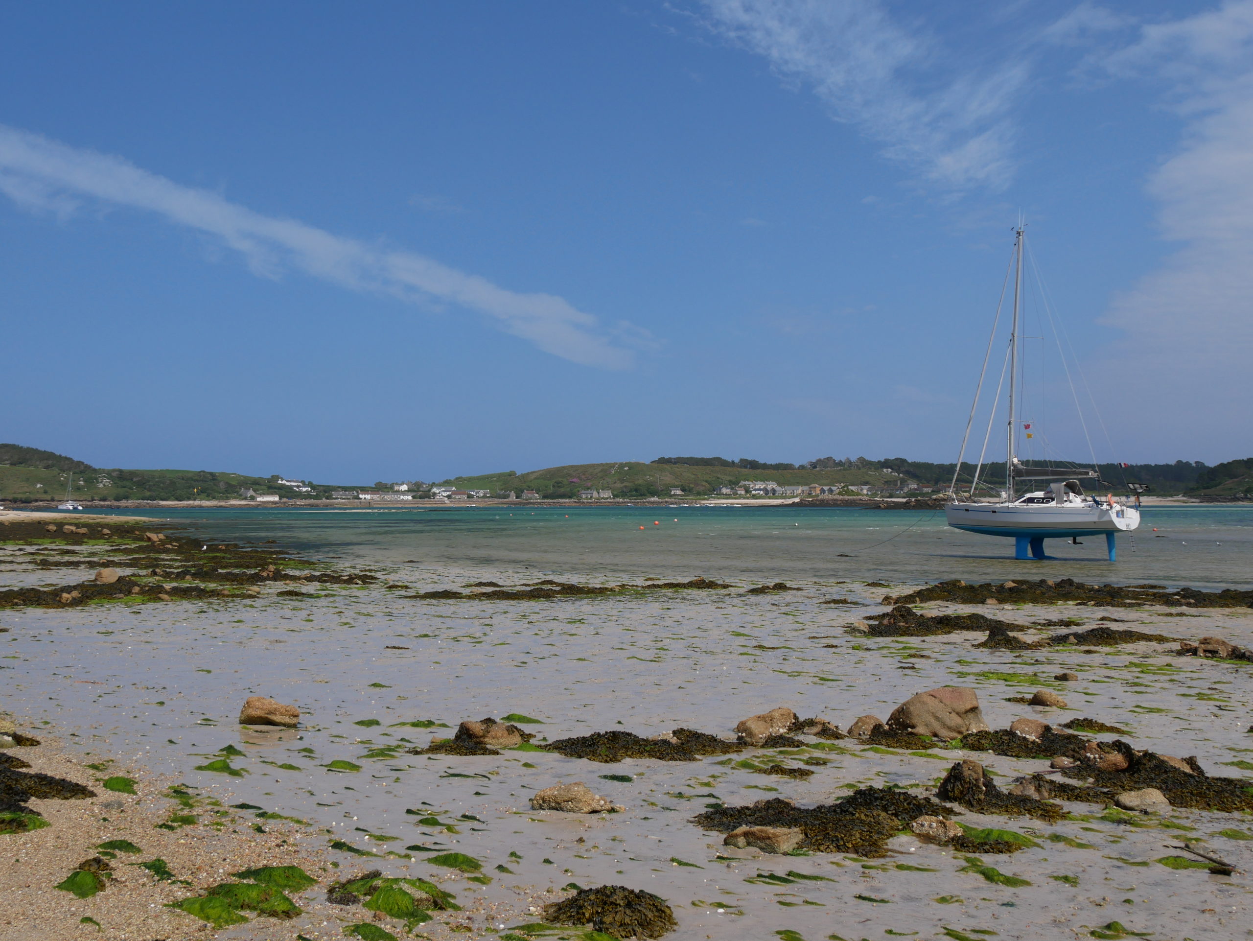 Second échouage : Green Bay sur l’île de Bryher.  Ce mouillage est parfait pour tous les vents du SW au N. Mais il est aussi praticable par vent assez fort de NE voir E. Dans ce cas il faut mouiller le plus au fond possible dans le coin NW de la baie. Bryher vous protège. A pleine mer il y a du clapot. Mais la aussi au moment de l’échouage c’est parfait (nous ne sentirons pas les échouages / deséchouages). Vent assez fort de ENE.